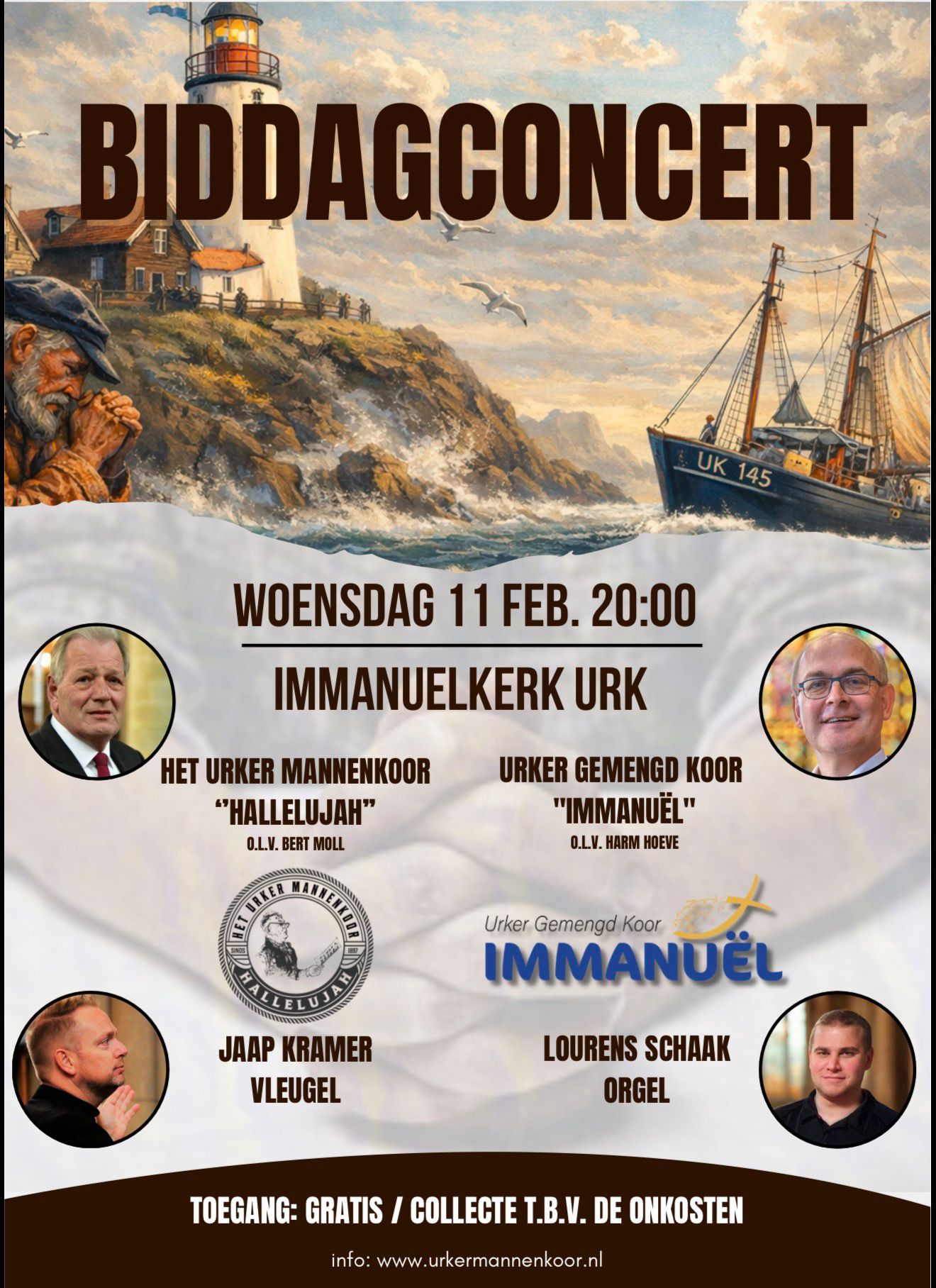 Immanuëlkerk Urk, NetherlandsMet medewerking van het: Urker Mannenkoor “Hallelujah” o.l.v. Bert Moll en het Urker Gemengd Koor Immanuël o.l.v. Harm Hoeve. Vleugel: Jaap Kramer - Orgel: Lourens Schaak Toegang is gratis - wel zal er een collecte voor de onkosten worden gehouden.