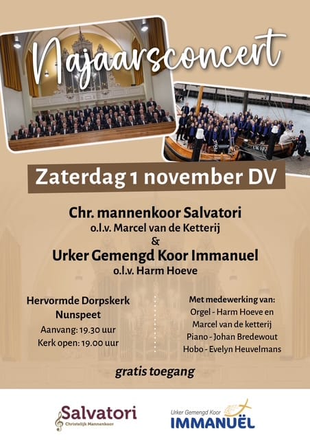 Hervormde Dorpskerk te NunspeetGezamenlijk concert van Chr. Mannenkoor Salvatori onder leiding van Marcel van de Ketterij & Urker Gemengd Koor Immanuel onder leiding van Harm Hoeve